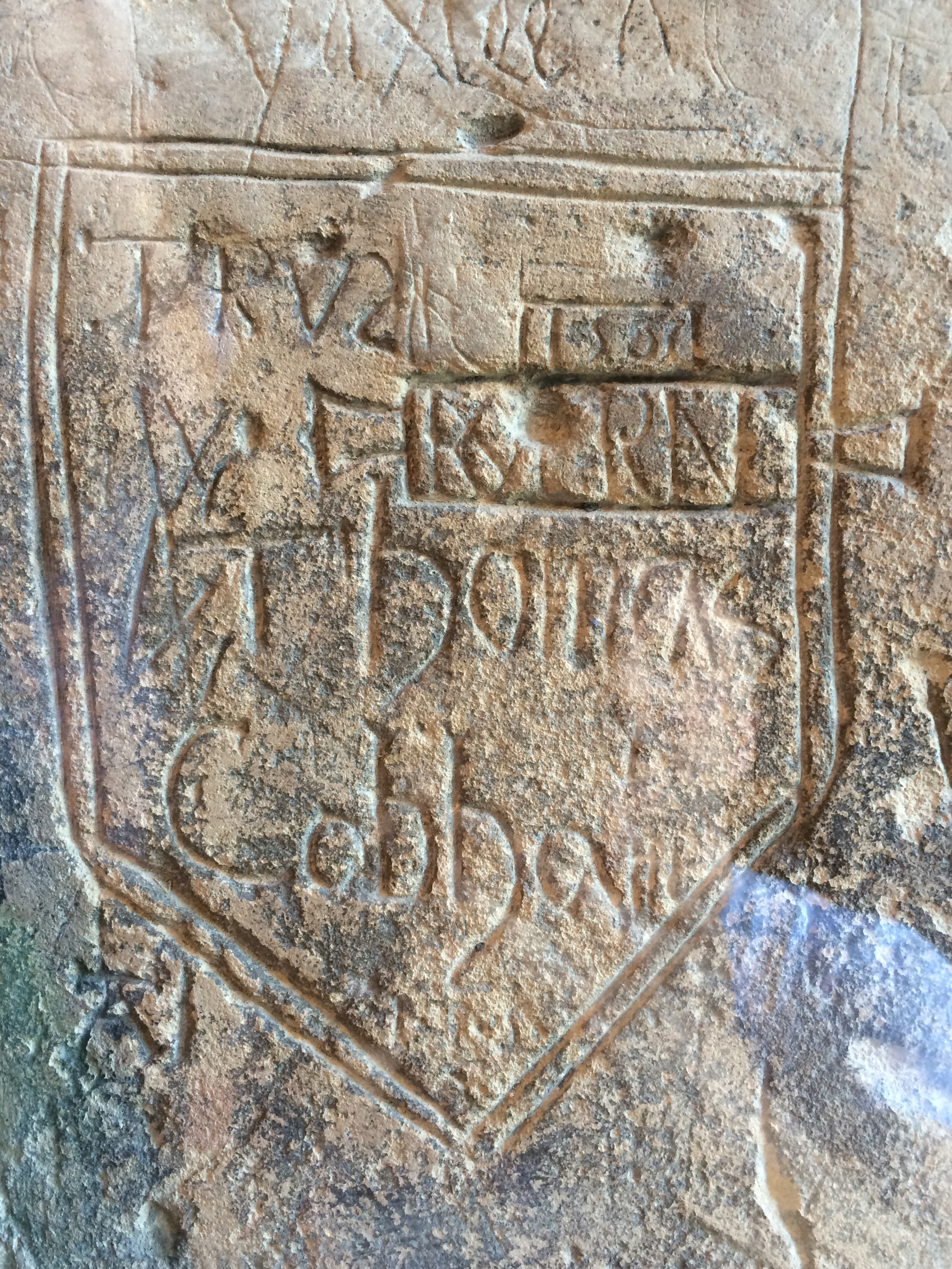 Cobham was, at least, confined to the Tower for several years; his deep-etched graffiti, ‘Thomas Cobham, 1555’, can still be seen carved into a window frame overlooking Tower Green. Two of his books still survive in the library of Magdalen College, Oxford – bequeathed to it by Ralegh’s future brother-in-law Arthur Throckmorton. Both volumes carry Cobham’s own scratched verses bemoaning the actions of fortune; pitying himself, his sorrows; hoping for “the happy day” ahead.  Released in early 1557, Cobham quickly showed how little he was capable of mastering himself: compulsive, careless, changeable, he would always be a sail for every wind. By the end of the summer, he was back in the Tower, having stabbed a catholic in a fight in Fleet Street and, on another occasion, led a gang of thieves into the house of an uncle in Blackfriars and stolen 200 marks.