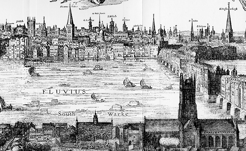 The western end of the church survived, however. In 1550, Paulet had given it to the immigrant Dutch community in London for their church; there is still a Dutch Church on the site today, although it has been rebuilt twice in the intervening 400 years. The church that Shakespeare knew had, said Stow, ‘a most fine-spired steeple, small, high, and straight; I have not seen the like’. You can see it on the short horizon of Visscher’s 1616 View of London, drawn from the South Bank. It is nestled, as Stow says, delicate and tall, between the Exchange and St Michael’s, more or less on a line north from Winchester House.