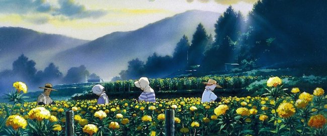 Art is everywhere in Only Yesterday, mediating memory, experience and emotion alike. When Taeko’s memories first come flooding back, there are, she says, “so many little details one after the other, playing in my head like a movie – almost overpowering me.” Art and life intertwine: crows in the evening sky remind her of a school play, when her performance in a minor role won her a professional part – only for her father to forbid it. Crushed by the familiar denial of her hopes, she takes heart from the words of a song from a children’s TV puppet show, the real-world 1960s Japanese show Hyokkori-Hyoutanjima: “We hate to cry, so we’ll laugh instead.” Toshio photographs her with the farmers, art and memory meeting as the shutter clicks. The first time they meet, they discover they have both just read a Basho haiku about safflowers; the poet helps them make sense of the flower, its place in Japanese culture.