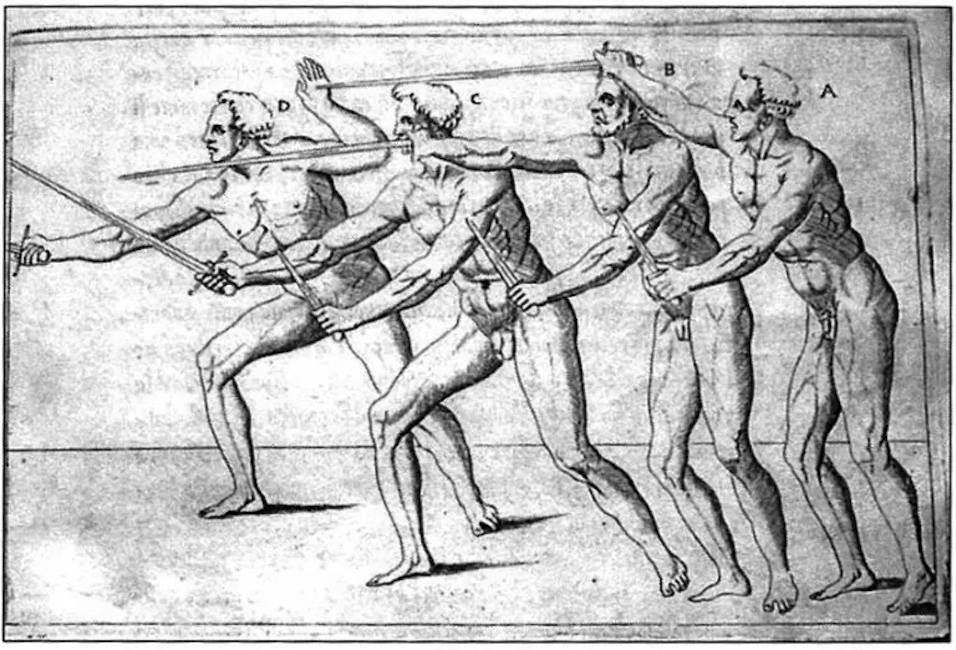 What changed was the publication of Camillo Agrippa’s Trattato di scientia d’arme in 1553. Agrippa took what had been a craft, handed down from master to apprentice, and turned it into a science. Specifically, Agrippa applied geometry to the use of the sword – “this pursuit is ultimately governed by points, lines, times, measures, and so forth”, he writes – taking Euclid out of the schoolroom, as Renaissance navigators and mapmakers were doing, and into the world of experience. (Euclid, jokes a character in Ben Jonson’s The New Inn, is “the only fencer of name now in Elysium”.)